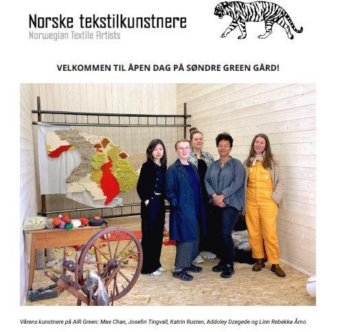 Åpen dag på Søndre Green 21.maiSøndre Green ønsker velkommen til åpen dag på Søndre Green gård lørdag 21. mai! Fra mandag 2. mai til mandag 30. mai bor og arbeider de fem tekstilkunstnerne Katrin Rusten, Jose;n Tingvall, Mae Chan, Linn Rebekka Åmo og Addoley Dzegede på Søndre Green gård gjennom Norske Tekstilkunstneres kunstneropphold AiR Green. Les mer om de fire kunstnerne som deltar på AiR Green denne våren, og fordypningsoppholdet AiR Green Studio her. Lørdag 21. mai inviterer vi til åpen dag på gården, hvor det blir mulighet til å treffe kunstnerne og se hva de har arbeidet med under oppholdet. Det vil være presentasjon av kunstnerne og gården, åpne atelierer, kunstnersamtaler og åpen kafé med hjemmebaktbrød, og egg og syltetøy fra gården. Se fullstendig program i lenken nedenfor! Her kan du lese hele invitasjonen og programmet for åpen dag 21.mai. (JPG, 0 B)
