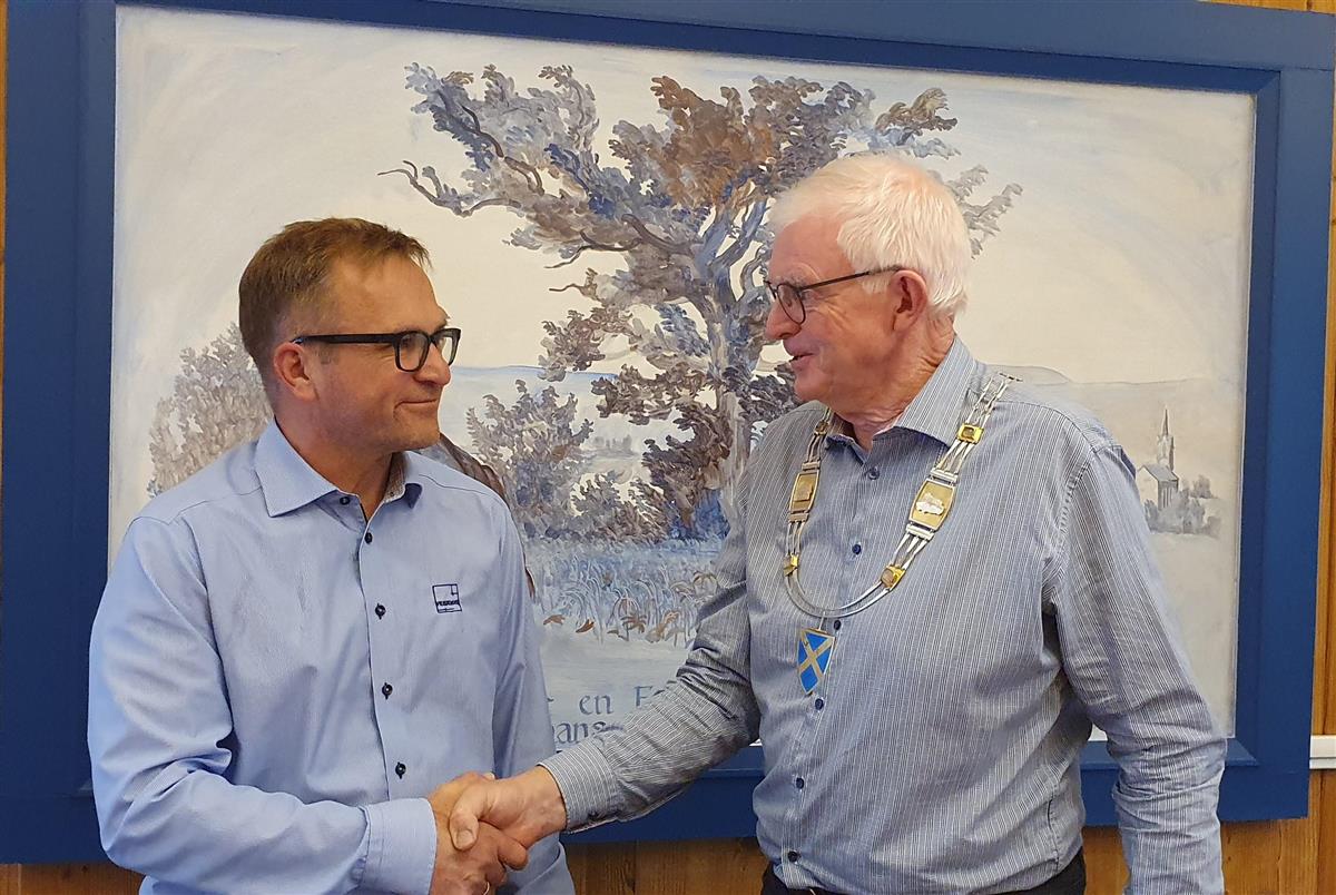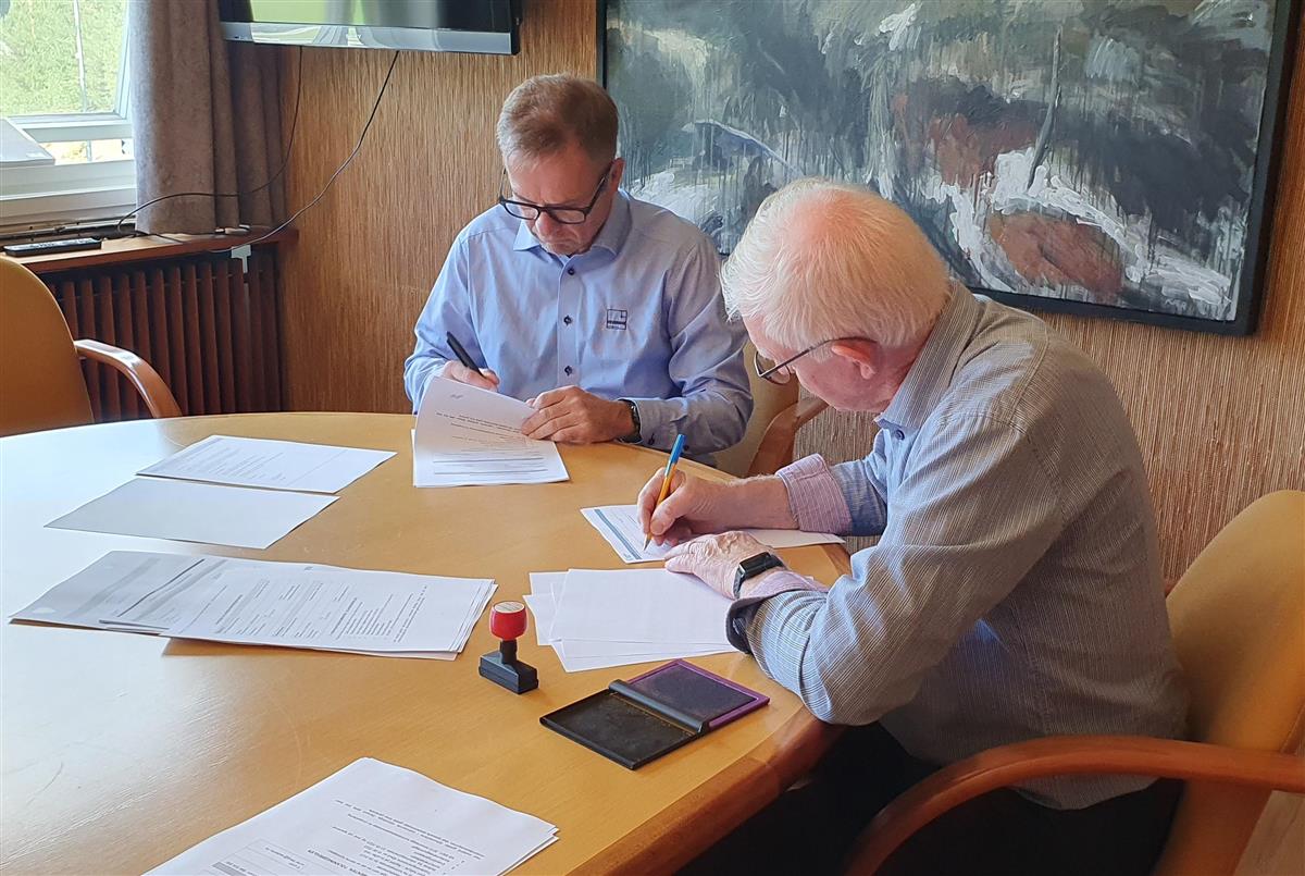 Krødsherad kommunes ordfører Knut Martin Glesne og Runar Berg, leder for prosjektutvikling og kalkyle i Veidekke Entreprenør AS, signerte i dag avtale om bygging av nye Krødsherad skole.