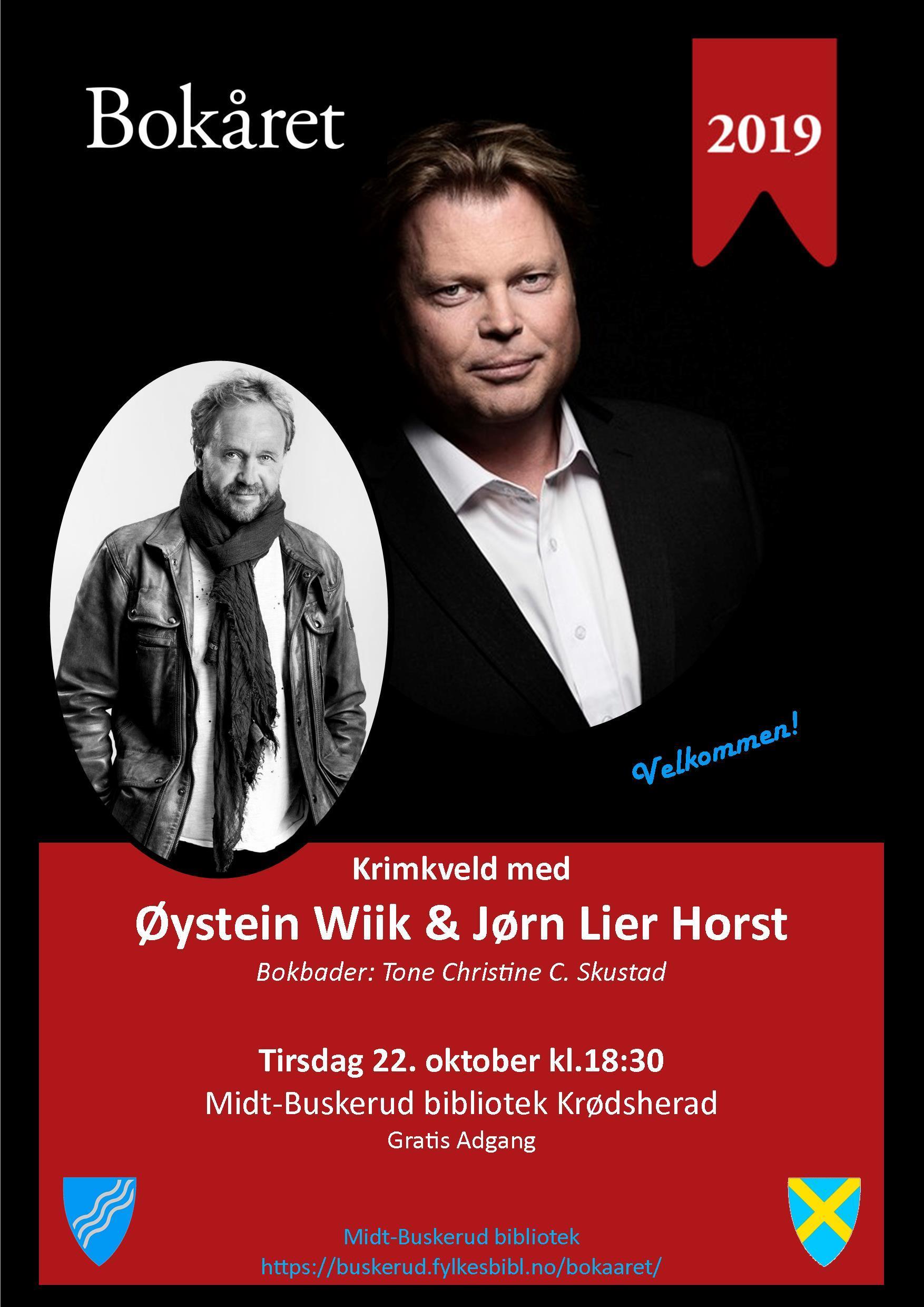 Bokbad i Krødsherad 22.10.1922.oktober kl. 18.30 blir det Bokbad på Midt-Buskerud bibliotek, Krødsherad, med de to kjente krimforfatterne Øystein Wiik og Jørn Lier Horst. De kommer til å fortelle om sitt forfatterskap og sin siste bok.Bokbader er Biblioteksjef Tone Christine C. Skustad.Arrangementet er en del av Bokåret 2019.Gratis inngang. Velkommen!