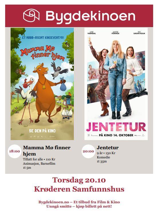 Bygdekino 20.10.2022 - Krøderen samfunnshus Bygdekinoen kommer til Krøderen samfunnshus 20.10.2022. Fra kl.18:00 kan du se Mamma Mø finner hjem (Tillat for alle) - Kjøp billett på nett her Fra kl. 20:00 kan du se Jentetur (9 år) - kjøp billett på nett her Her finner du filminformasjon