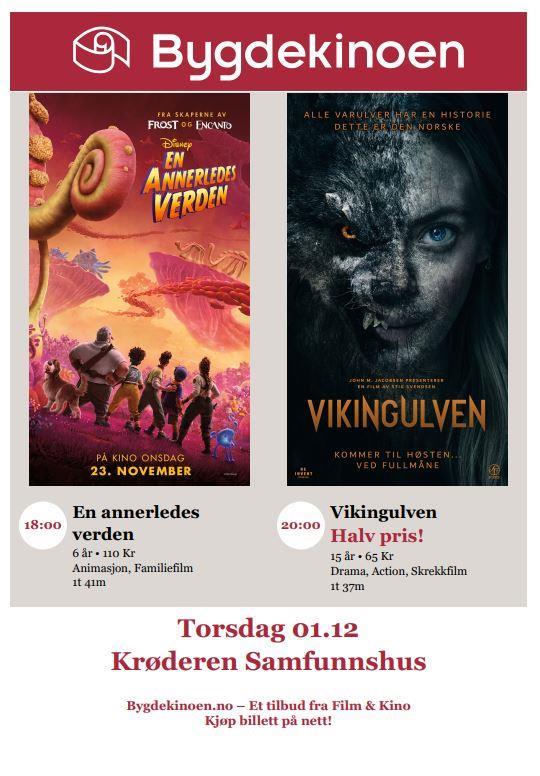 Bygdekino på Krøderen samfunnshus 01.12.Torsdag 1.desember ruller bygdekinoen igjen inn mot Krøderen samfunnshus. Denne kvelden kan vi ikke love dere julestemning, men vi lover alt fra actionfylt eventyr til varulver. Merk dere at det er halv pris på filmen Vikingulven. Fra Kl.18:00; En annerledes verden (6 år) - kjøp billett på nett her Fra kl.20:00; Vikingulven (15 år) - kjøp billett på nett her Her finner du filminformasjon