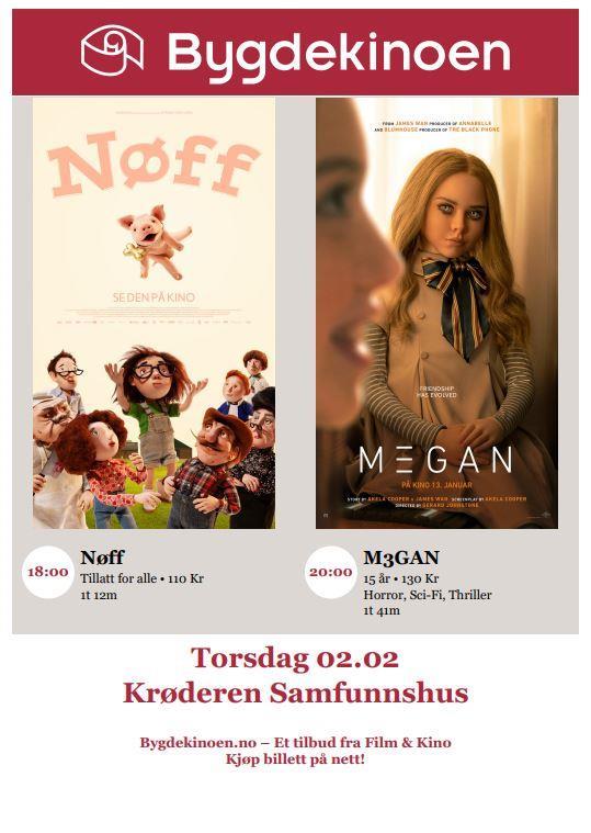Bygdekino på Krøderen samfunnshus 02.02.2023Bygdekinoen kommer til Krøderen samfunnshus torsdag 02.02.23. Kl.18:00 - Nøff (Tillatt for alle) - Kjøp billetter her Kl.20:00 - M3GAN - (15 år) - Kjøp billetter her Hele filmprogrammet finner du her