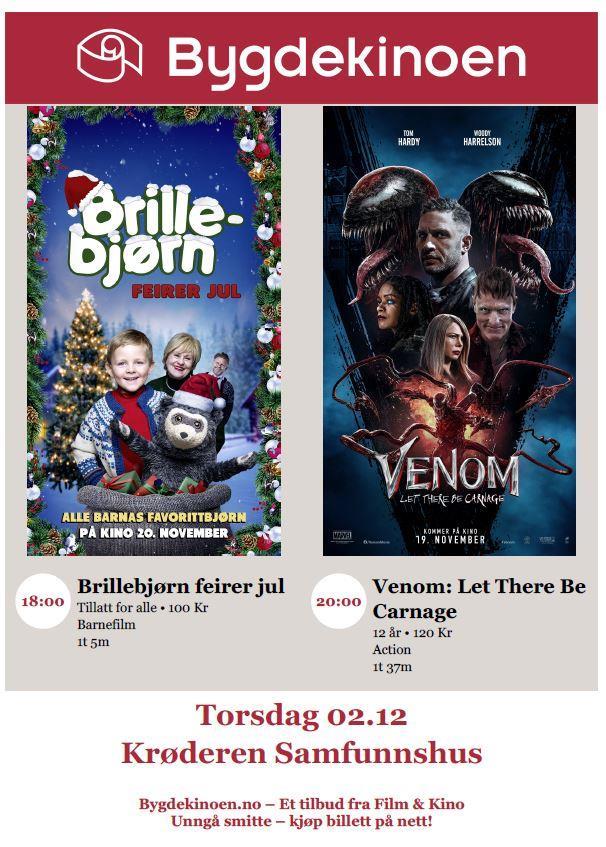Bygdekino på Krøderen samfunnshus 02.12.2021Bygdekinoen kommer til Krøderen samfunnshus torsdag 02.12.2021. Fra kl. 18:00 kan du se Brillebjørn feirer jul, filmen er tillatt for alle - Kjøp billetter her Fra kl. 20:00 vises Venom: Let There Be Carnage - Kjøp billetter her Her finner du filminformasjon
