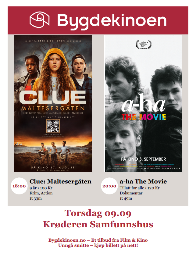 Bygdekino på Krøderen samfunnshus 09.september.Bygdekinoen snurrer film igjen på Krøderen samfunnshus 09.september.Kl. 18:00 - Clue: MaltesergåtenKl. 20:00 - a-ha The MovieSe hele filmprogrammet og bestill billetter på nett her Forestillingene er forbeholdt innbyggere i kommunen og tar imot max 40 besøkende pr.visning.