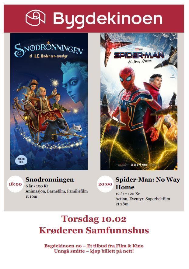 Bygdekino på Krøderen samfunnshus 10.02.22Torsdag 10.02 er det tid for bygdekino på Krøderen samfunnshus. Disse filmene ruller over lerretet: Kl.18:00 - Snødronningen (6 år) - kjøp billetter her Kl. 20:00 - Spider-man: No Way Home (12 år) - kjøp billetter her Her finner du filminformasjon