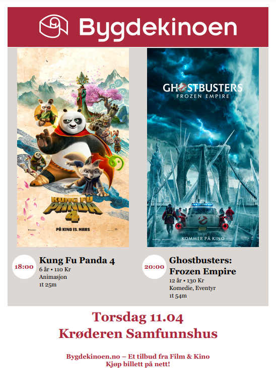 Bygdekino på Krøderen samfunnshus 11.04.2024Bygdekinoen kommer til Krøderen samfunnshus 11.04.2024.Kl.18:00 Kung Fu Panda 4 (6 år)Kl.20:00 Ghostbusters: Frozen Empire (12 år)Billetter kan du kjøpe på nettsiden til bygdekinoen.no