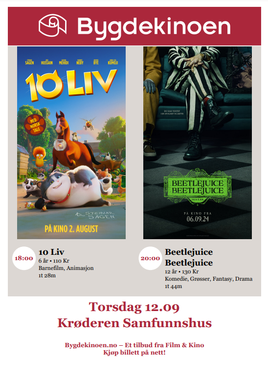 Fra kl.18:00 kan du se 10 Liv (6 år), og fra kl.20:00 vises Beetlejuice Beetlejuice (12 år).