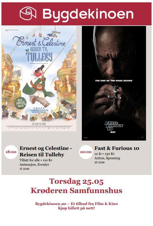 Bygdekino på Krøderen samfunnshus 25.05.2023Bygdekinoen kommer til Krøderen samfunnshus torsdag den 25.05.2023. Kl.18:00 - Ernest og Celestin - Reisen til Tulleby (Tillatt for alle) - Kjøp billett på bygdekinoen.no Kl. 20:00 - Fast & Furius 10 (12 år) - Kjøp billett på bygdekinoen.no Filmprogram kan du se på bygdekinoen.no