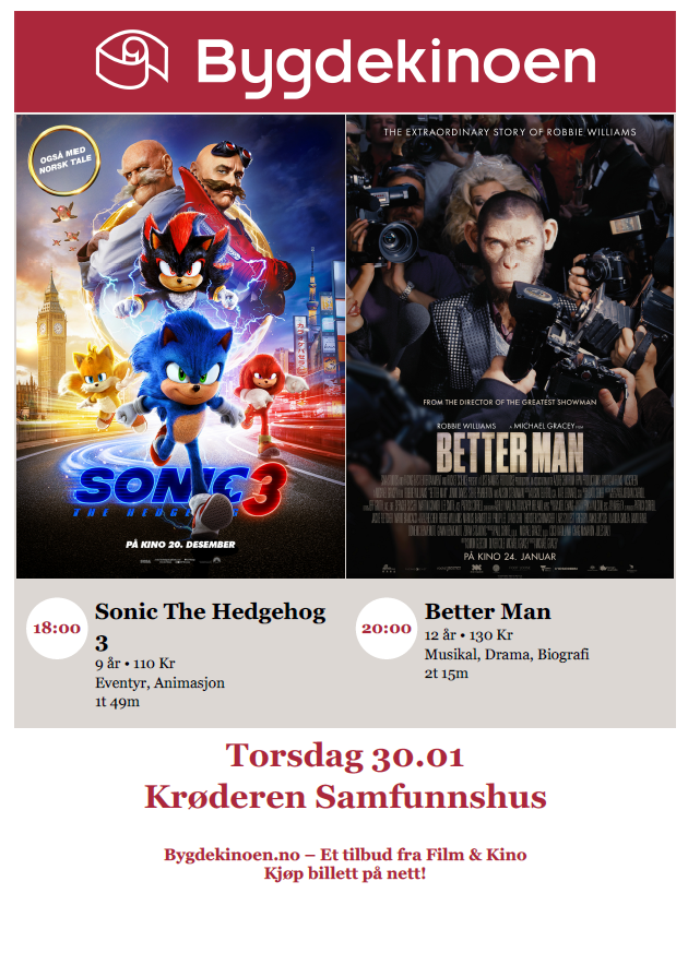 Bygdekino på Krøderen samfunnshus 30.01.2025Bygdekinoen kommer tilbake til Krøderen samfunnshus 30.01.2025.Fra kl. 18:00: Sonic The Hedgehog 3 (9år)Fra kl. 20:00 Better Man (12år)Du kan se hele filmprogrammet og bestille billetter på bygdekinoen.no Publisert 29.01.2025 10.09 Sist endret 30.04.2025 07.52