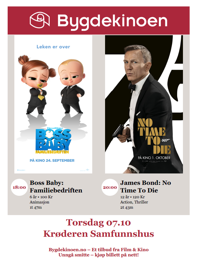 Bygdekino på Krøderen samfunnshus torsdag 07.10.21