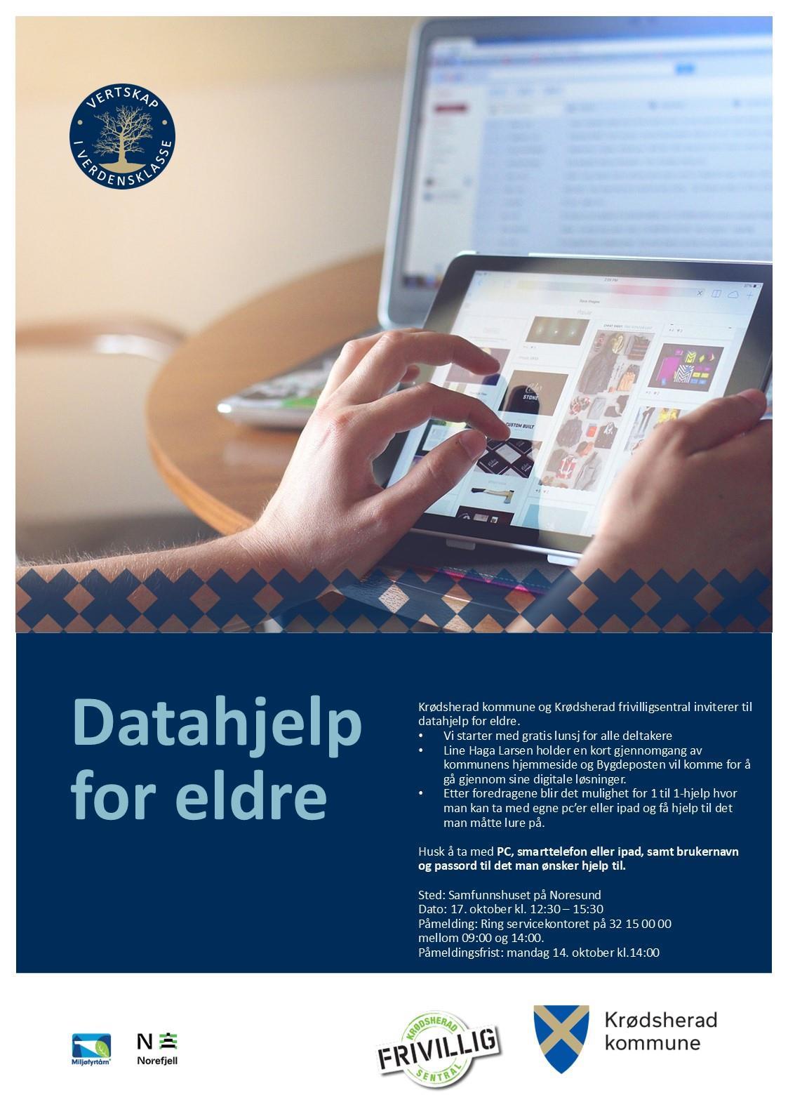 Datahjelp for eldre innbyggereKrødsherad kommune og Krødsherad frivilligsentral inviterer til datahjelp for våre eldre innbyggere. ProgramVi starter med gratis lunsj for alle deltakereLine Haga Larsen holder en kort gjennomgang avkommunens hjemmeside og Bygdeposten vil komme for ågå gjennom sine digitale løsninger.Etter foredragene blir det mulighet for 1 til 1-hjelp hvorman kan ta med egne pc’er eller ipad og få hjelp til detman måtte lure på.Husk å ta med PC, smarttelefon eller ipad, samt brukernavnog passord til det man ønsker hjelp til.Tid, sted og påmeldingSted: Samfunnshuset på NoresundDato: 17. oktober kl. 12:30 – 15:30Påmelding: Ring servicekontoret på 32 15 00 00 mellom 09:00 og 14:00.Påmeldingsfrist: mandag 14. oktober kl.14:00 Publisert av Merete Holen Publisert 02.10.2024 15.37