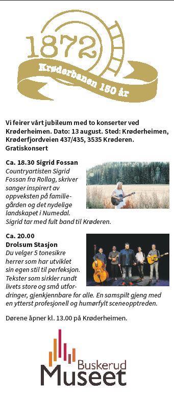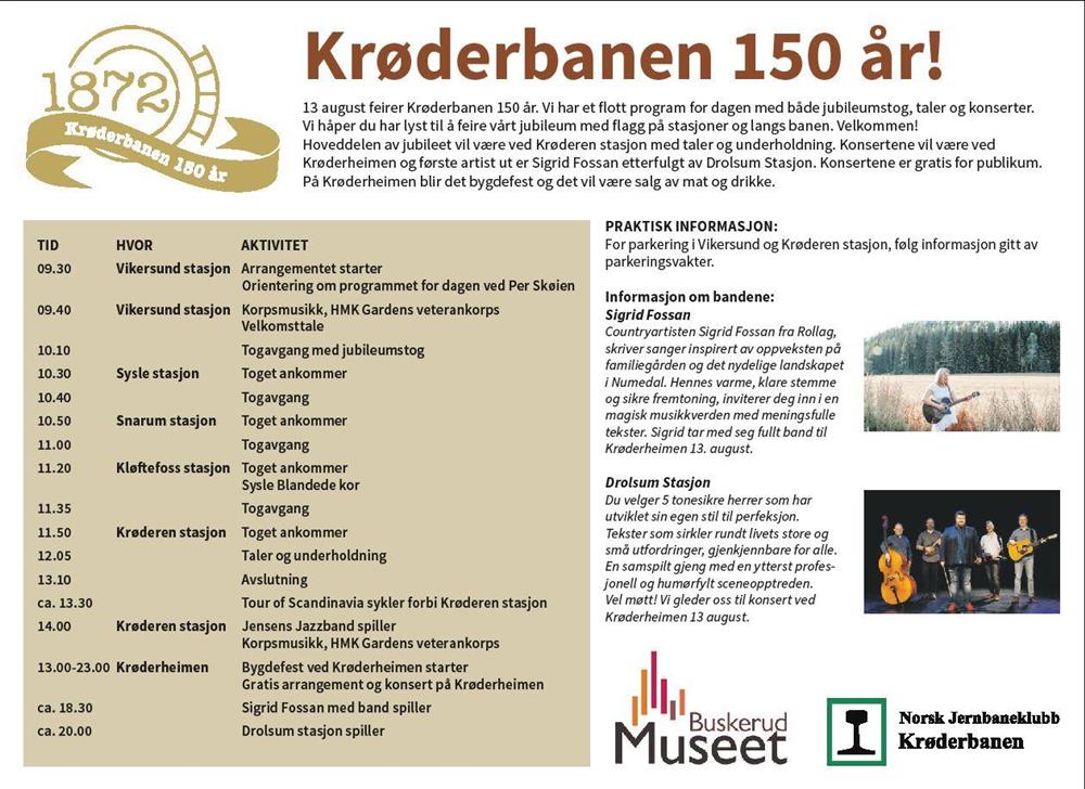 Hoveddelen av jubileet vil være ved Krøderen stasjon med taler og underholdning. Konsertene vil være ved Krøderheimen og første artist ut er Sigrid Fossan etterfulgt av Droslum Stasjon. Konsertene er gratis for publikum.