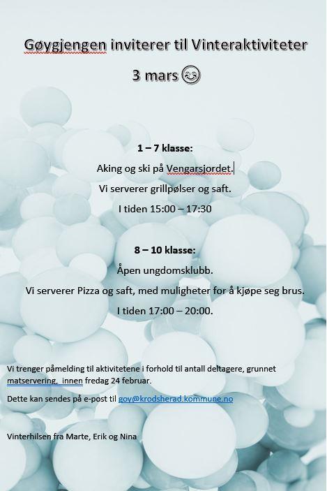 Påmelding gjøres på epost til: goy@krodsherad.kommune.no, innen fredag 24.februar.