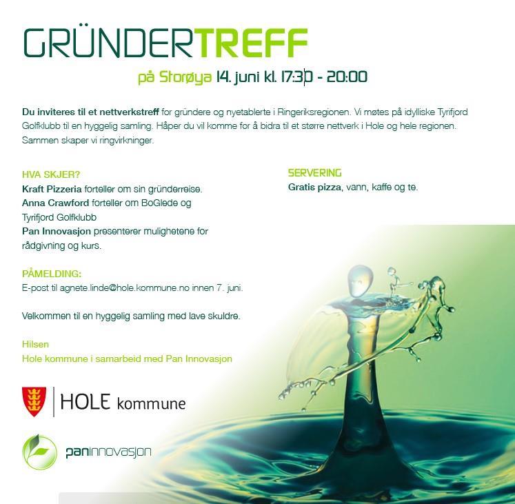 Du inviteres til et nettverkstreff for gründere og nyetablerte i Ringeriksregionen. Vi møtes på idylliske Tyrifjord Golfklubb til en hyggelig samling. Håper du vil komme for å bidra til et større nettverk i Hole og hele regionen. Sammen skaper vi ringvirkninger.