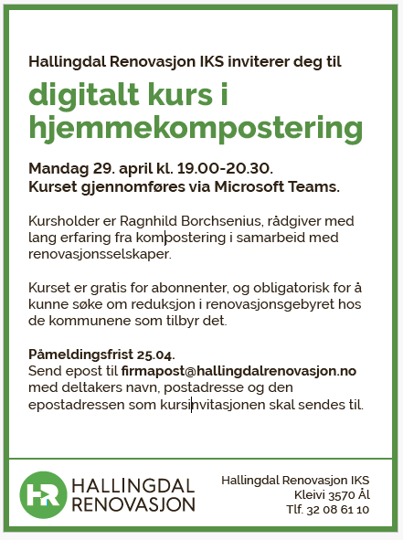 Hallingdal Renovasjon IKS inviterer deg til digitalt kurs i hjemmekomposteringHallingdal Renovasjon IKS inviterer deg til digitalt kurs i hjemmekompostering.Dag: Mandag 29. aprilTid: kl. 19.00-20.30.Sted: Kurset gjennomføres via Microsoft Teams.Kursholder er Ragnhild Borchsenius, rådgiver medlang erfaring fra kompostering i samarbeid med renovasjonsselskaper.Kurset er gratis for abonnenter, og obligatorisk for å kunne søke om reduksjon i renovasjonsgebyret hos de kommunene som tilbyr det.Påmeldingsfrist: 25.04.24Send epost til firmapost@hallingdalrenovasjon.no med deltakers navn, postadresse og den epostadressen som kursinvitasjonen skal sendes til.Hallingdal Renovasjon IKSKleivi 3570 ÅlTlf. 32 08 61 10