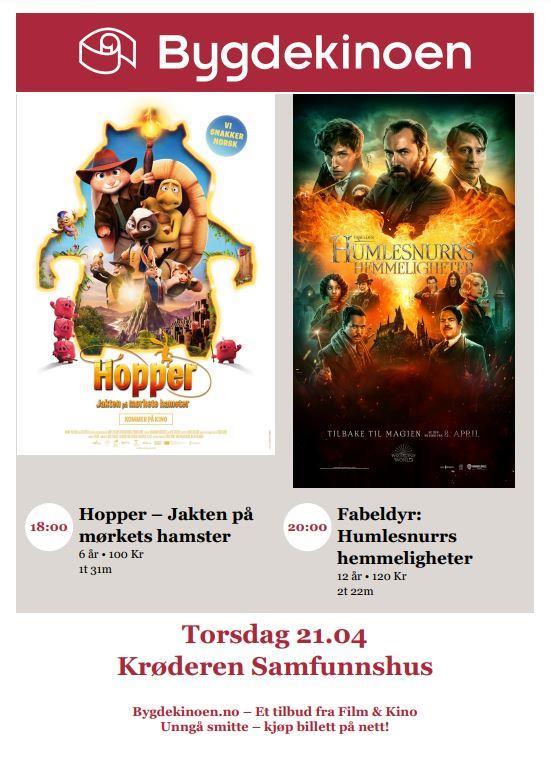 Husk bygdekino på Krøderen samfunnshus 21.04.22Bygdekinoen kommer til Krøderen samfunnshus 21.04. Følgende filmer står på programmet: Kl. 18:00 Hopper – Jakten på mørkets hamster (Norsk tale Utekstet 2D) Kjøp billett på nett her Kl. 20:00 Fabeldyr: Humlesnurrs hemmeligheter (2D Original tale Norsk tekst) Kjøp billett på nett her Her finner du hele filmprogrammet