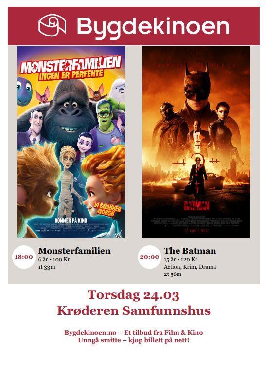Husk bygdekino på Krøderen samfunnshus 24.03.22 Det er tid for bygdekino på Krøderen samfunnshus torsdag 21/3 fra kl.18:00. Kl. 18:00 Monsterfamilien (6 år) - Kjøp billett på nett her Kl. 20:00 The Batman (15 år) - Kjøp billett på nett her Her finner du hele filmprogrammet