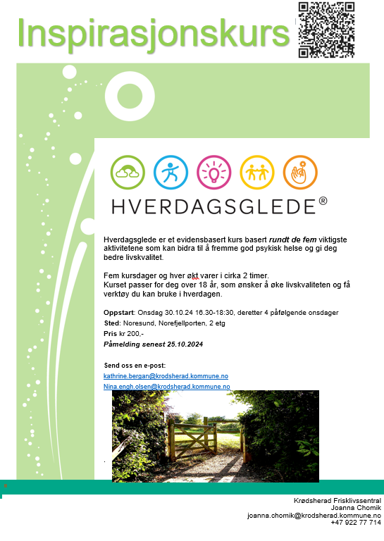 Hverdagsglede - insipirasjonskurs Hverdagsglede er et forskningsbasert kurs basert rundt de fem viktigste aktivitetene som kan bidra til å fremme god psykisk helse og gi deg bedre livskvalitet. Fem kursdager og hver økt varer i cirka 2 timer. Kurset passer for deg over 18 år, som ønsker å øke livskvaliteten og få verktøy du kan bruke i hverdagen.Oppstart: Onsdag 15.01.25 16.30-18:30, deretter 4 påfølgende onsdagerSted: Noresund, Norefjellporten, 2 etgPris: kr 200,-Påmelding senest 10.01.2025Send oss en e-post for å melde deg på: kathrine.bergan@krodsherad.kommune.noNina.engh.olsen@krodsherad.kommune.nojoanna.chomik@krodsherad.kommune.no Publisert 04.12.2024 10.25 Sist endret 30.04.2025 07.52