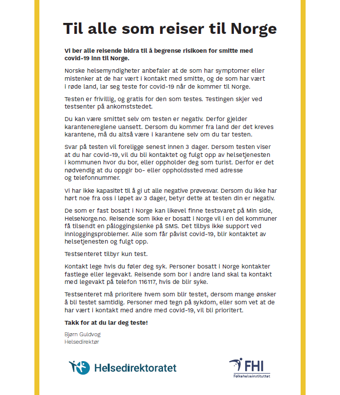 Informasjon fra Helsedirektoratet til alle som reiser til NorgeHelsedirektoratet ber alle reisende bidra til å begrense risikoen for smitte med covid-19 inn til Norge. Norske helsemyndigheter anbefaler at de som har symptomer eller mistenker at de har vært i kontakt med smitte, og de som har vært i røde land, lar seg teste for covid-19 når de kommer til Norge. Testen er frivillig, og gratis for den som testes. Testingen skjer ved testsenter på ankomststedet. Les mer her: Her finner du informasjonsskriv til reisende om testing ved koronatestsentre ved grenseoverganger. (PDF, 0 B)