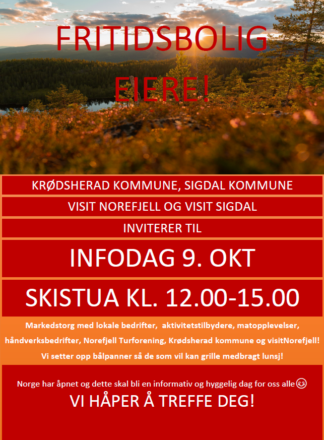 Informasjonsdag for fritidsbolig eiere 9.oktober 2021. Krødsherad kommune, Sigdal kommune, Visit Norefjell og Visit Sigdal inviterer fritidsbolig eiere til infodag på skistua 9.oktober kl.12:00 - 15:00. Vi ønsker deg velkommen til en informativ dag.