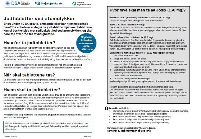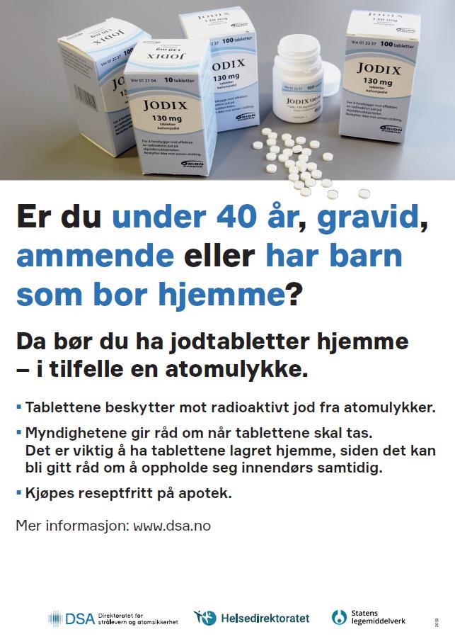 Er du under 40 år, gravid, ammende eller har hjemmeboende barn? Da anbefales du til å ha jodtabletter hjemme. Tablettene kan gi beskyttelse mot radioaktivit jod ved atomulykker, og skal bare tas etter råd fra myndighetene.