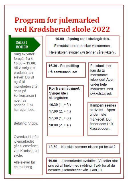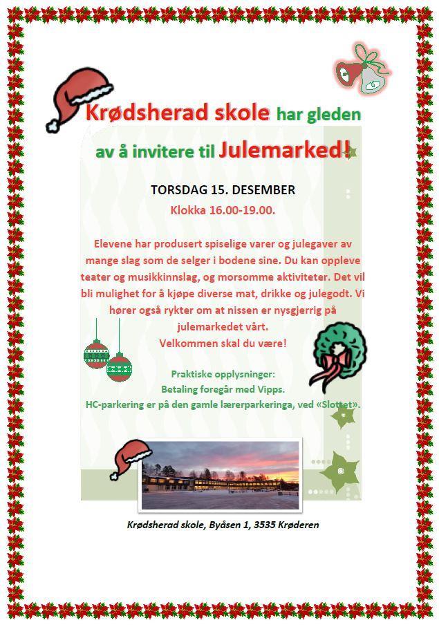 Krødsherad skole inviterer til Julemarked 15.12.2022Krødsherad skole har gleden av å invitere til julemarked, torsdag 15.12.22 kl. 16:00-19:00. Velkommen til julemagi. Informasjonsplakat om julemarked ved Krødsherad skole Program for julemarkedet