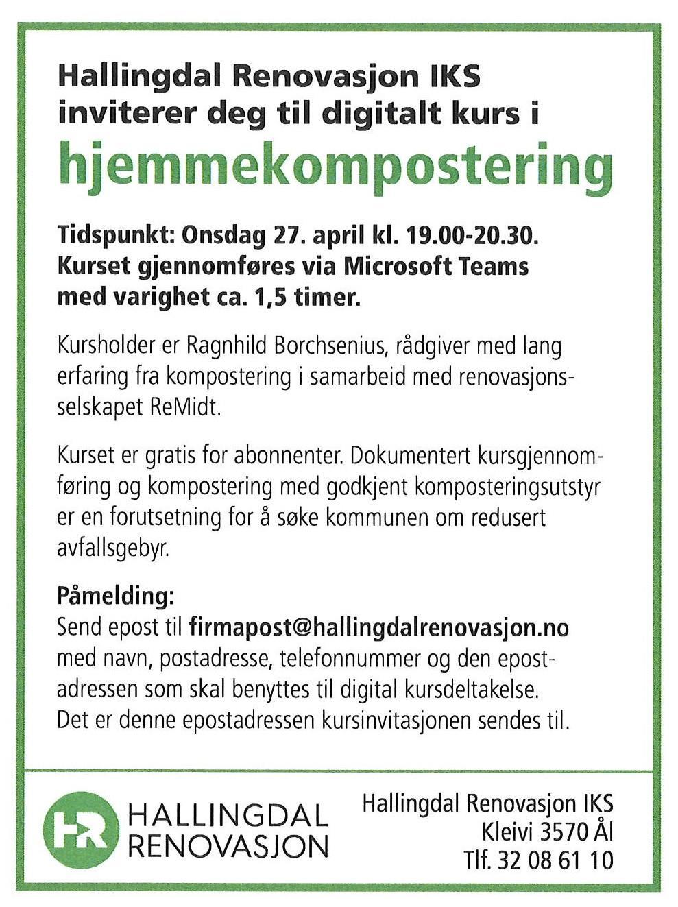 Kurs i hjemmekompostering Hallingdal Renovasjon IKS holder kurs i hjemmekompostering den 27.04.22 kl 19.00. Kurset er på Teams.