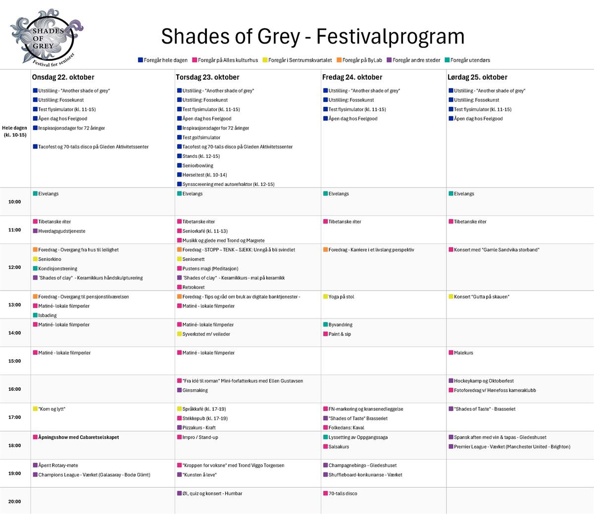 Shades of grey - en festival for seniorene!Velkommen til en helt ny festivalopplevelse i Hønefoss! I fire dager, fra onsdag 22. oktober til lørdag 25. oktober fylles Hønefoss med aktivitet, glede og fellesskap når det for aller første gang arrangeres Shades of Grey – en festival for seniorene! Krødsherad er en del av Ringeriksregionen, og dermed er kryllinger også invitert. Festivalen er laget spesielt for deg som er 60+, og byr på et variert program med konserter, foredrag, utstillinger, kurs, trim, kultur, humor og sosiale møteplasser. Her kan du lære noe nytt, oppleve gode øyeblikk – og møte både gamle og nye venner. Festivalen setter seniorene i sentrum og viser at alder først og fremst er en ressurs.Les mer om festivalen på nettsiden Hønefoss ByÅpent for alleDe fleste arrangementene er gratis og åpne for alle.Du finner mere informasjon om festivalen herHønefoss ByShades of Grey på FacebookNedenfor ser du hele programmet for festivalen.Trykk på bildet for å se det i større versjon.Last ned programmet (JPG, 575 kB) Publisert 10.10.2025 14.02 Sist endret 10.10.2025 14.05