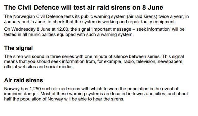 Sivilforsvaret tester flyalarmene i Norge 8. juni.