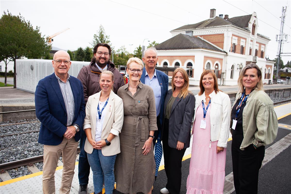 Vel fremme på Hokksund stasjon etter en historisk togtur. Fra venstre Syver Leivestad (ordfører, Hole), Andreas Kagiavas Torp (ordfører, Krødsherad), Kristine Belsby (varaordfører, Jevnaker), Sunni Grøndahl Aamodt (ordfører, Modum, Runar Johansen (ordfører, Ringerike), Gunn Elisabeth Alm Thoresen (ordfører, Gran), Margaret Frøisli (varaordfører, Lunner) og Cecilie Knibe Kroglund (statssekretær, samferdselsdepartementet).