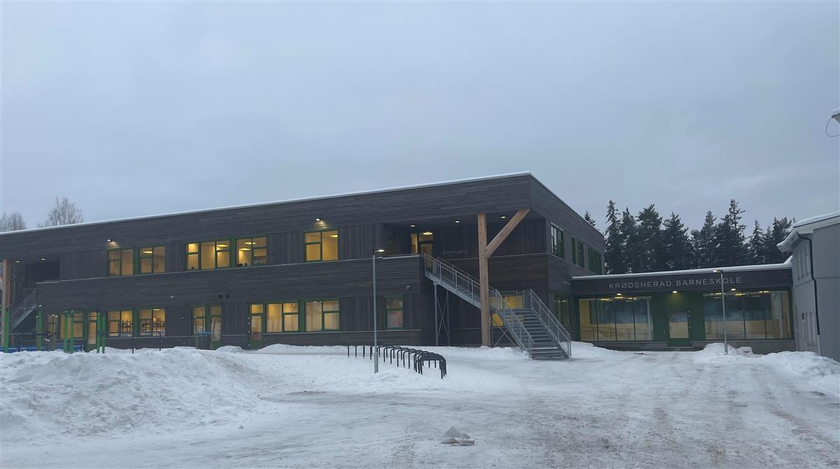 Velkommen til åpen kveld på nye Krødsherad barneskoleVi åpnet den nye, flotte skolen på Noresund 6. januar, og nå ønsker vi å invitere alle skuelystne til åpen kveld tirsdag 27.01 fra kl. 19.00.Kommunen stiller med representanter som kan vise-, bli med rundt i bygget og svare på spørsmål. FAU har vaffelsalg i kantina på kommunehuset for å skaffe inntekter til sine gode formål fra kl. 18.30, og det er hyggelig hvis noen kommer litt tidligere enn skolevandringen starter. Møt opp ved hovedinngangen til skolen der hvor kommunehuset og skolen bindes sammen. Krødsherad barneskole er en skofri skole, så dere må enten ta på skotrekk (som deles ut ved ankomst) eller ta av skoene ved inngangen. Vi tar sikte på å avslutte innen kl. 20.30. Skolen har invitert foreldre, søsken og besteforeldre til åpen kveld i forkant av dette arrangementet, fra kl.17:00 - 19:00. Publisert 21.01.2026 10.20 Sist endret 04.02.2026 15.32