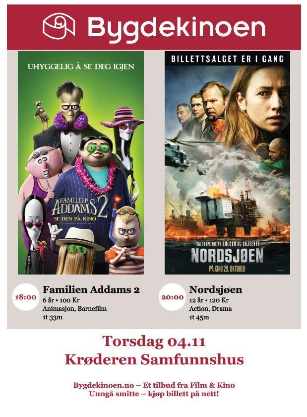Velkommen til bygdekino på Krøderen samfunnshus 4.novemberVelkommen til en hyggelig kinokveld på Krøderen samfunnshus 4.november. Kl.18:00 - Familien Addams 2 - kjøp billett her Kl. 20:00 - Nordsjøen (Aldersgrense 12 år) - kjøp billett her Se hele filmprogrammet her