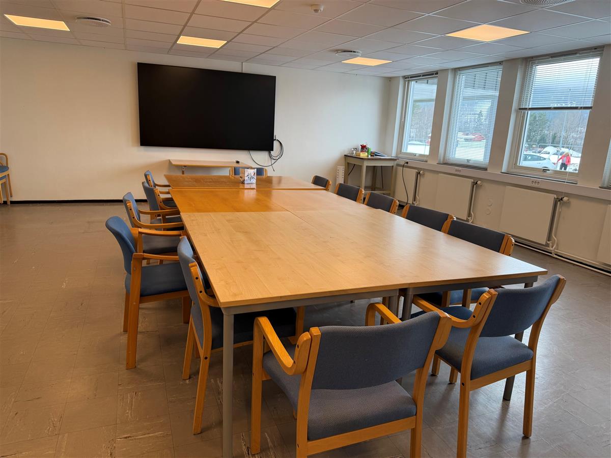 Utleie kommunehus - Møterom Ravnås u.etgMøterommet ligger i underetasjen på kommunehuset. Inngang nede ved parkeringsplassen. MøblerAntall stoler: 20Antall bord: 7AV- og presentasjonsutstyrSkjerm: JaHDMI-/USB‑C‑tilkobling: JaWifi tilgjengelig: JaMøteromshøyttaler: NeiAnnetUniversell utforming (rullestoltilgang, HC‑toalett): JaToalett: JaÅpning/stenging og nøkkelhåndtering: Etter avtale med servicetorget Møterom Ravnås i underetasjen på kommunehuset Publisert 10.03.2026 09.43 Sist endret 10.03.2026 10.09