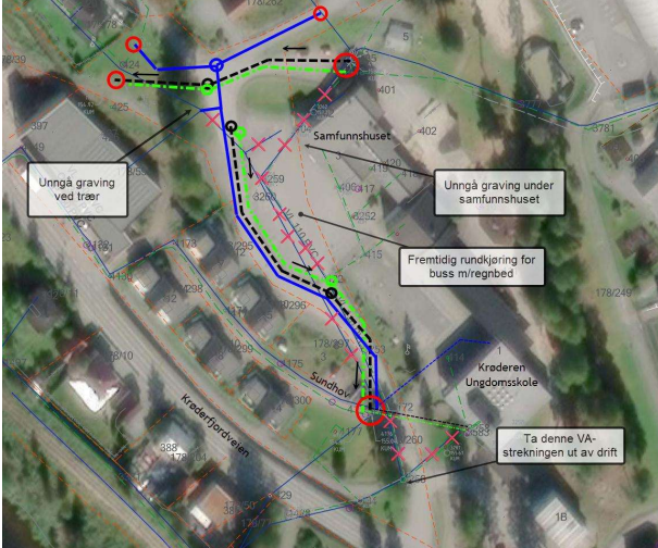 Vann- og avløpsledningene som i dag går under hjørnet på samfunnshuset vil bli sanert og bunnledningene fra samfunnshuset knyttes til nytt VA-anlegg langs veien.