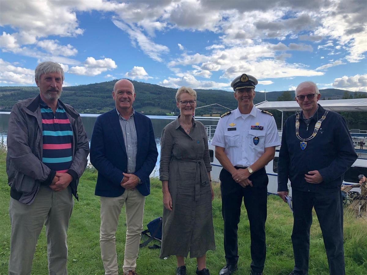 Fra venstre: Harald Antonsen, politisk representant fra Jevnaker kommune Syver Leivestad, ordfører i Hole kommune Sunni Grøndahl Aamodt, ordfører i Modum kommune Ola Bøe-Hansen, nestkommanderende i Forsvarets veterantjeneste Knut Martin Glesne, ordfører i Krødsherad kommune